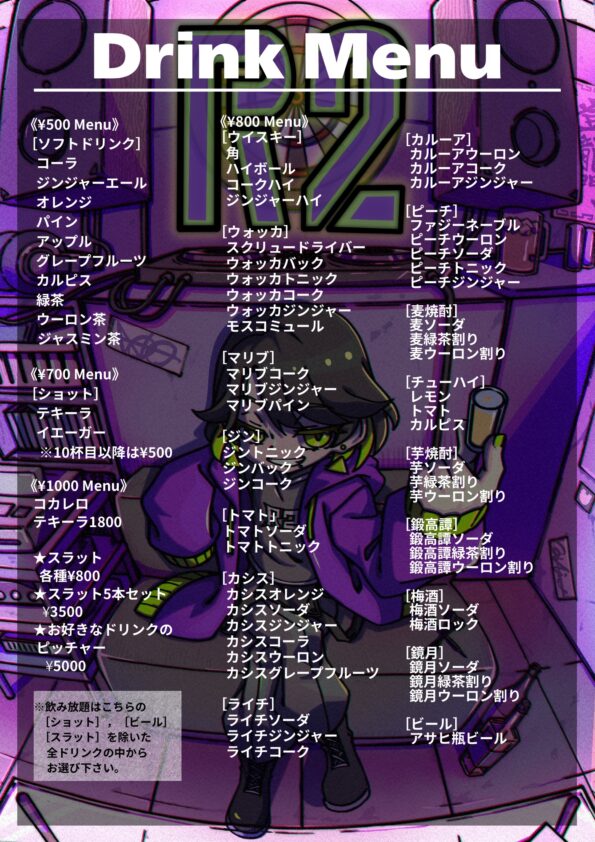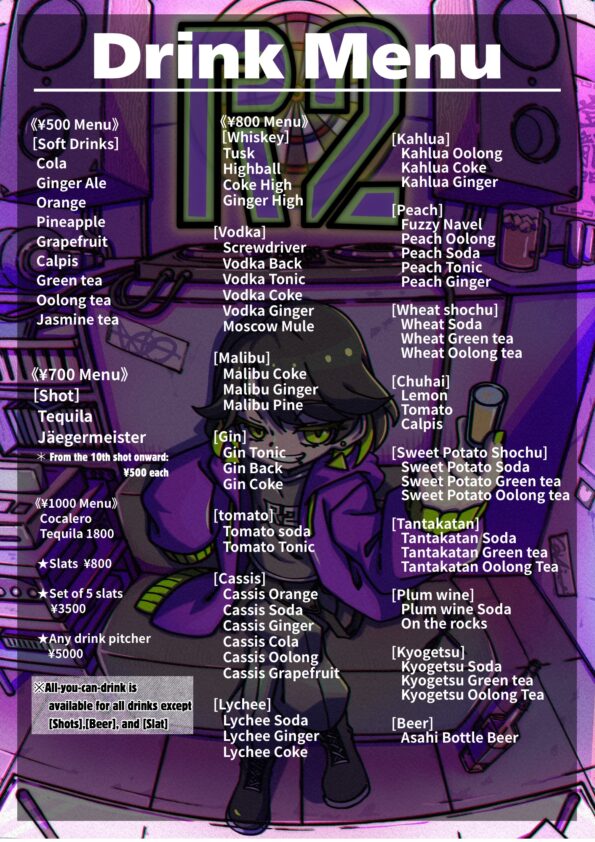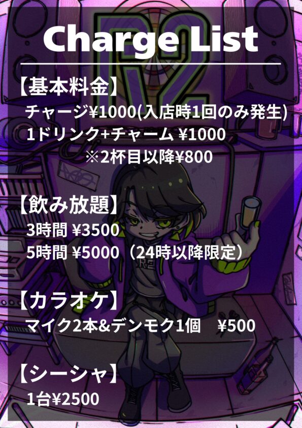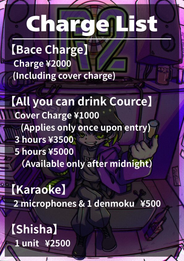 MENU100種類ほどの豊富なドリンクメニューを取り揃えており、飲み放題プランもございます。 カラオケやシーシャもご利用いただけ、その他店内設備は無料でご利用いただけます♪ ※タイムチャージはいただいておりません